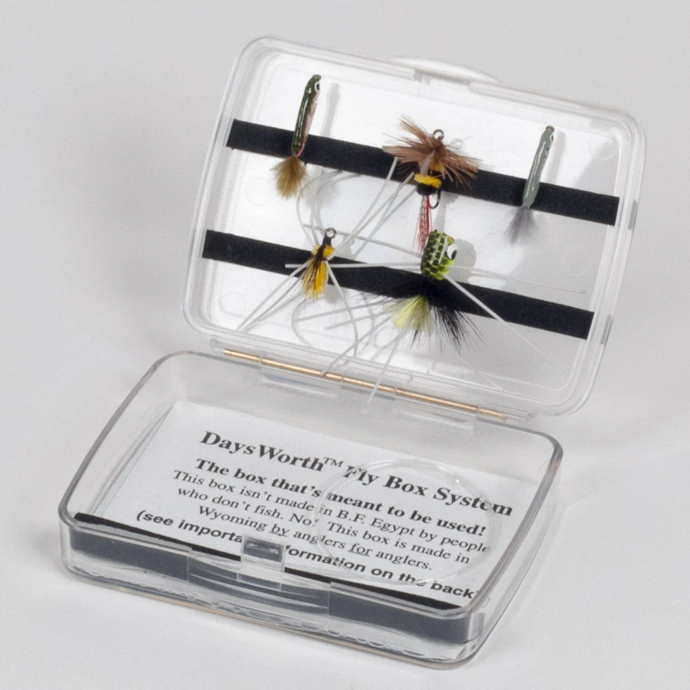 - A double sided box with self-sealing “blue” material stips for sticking fly hooks into on one side and a high energy magnet on the other for holding smaller flies securely. Also includes an additional “blue” material strip that can be positioned as desired by the angler, and a mono security leash to attach the box to a convenient loop on a vest, chest pack, or lanyard system.
