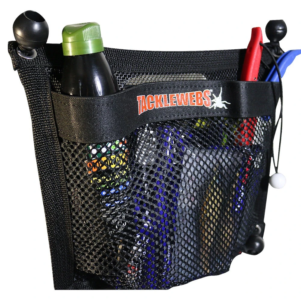 TackleWebs bags come with stainless steel grommets and six bungee cord straps that can be threaded through the grommets allowing for amazing versatility when it comes to locations TackleWebs can be installed. The patented mesh design allows air to flow through the bag for minimal wind resistance and optimizing drying of wet contents such as dock lines or cast nets for example. The pocket design allows for easy access and utilizes a hook and loop closure for securing content while avoiding corrosion and stuck zippers. TackleWebs are perfect for flats skiffs, center consoles, sport fishers, kayaks, canoes, pontoons, sailboats, air boats and more. Dimensions: 12″x10″.