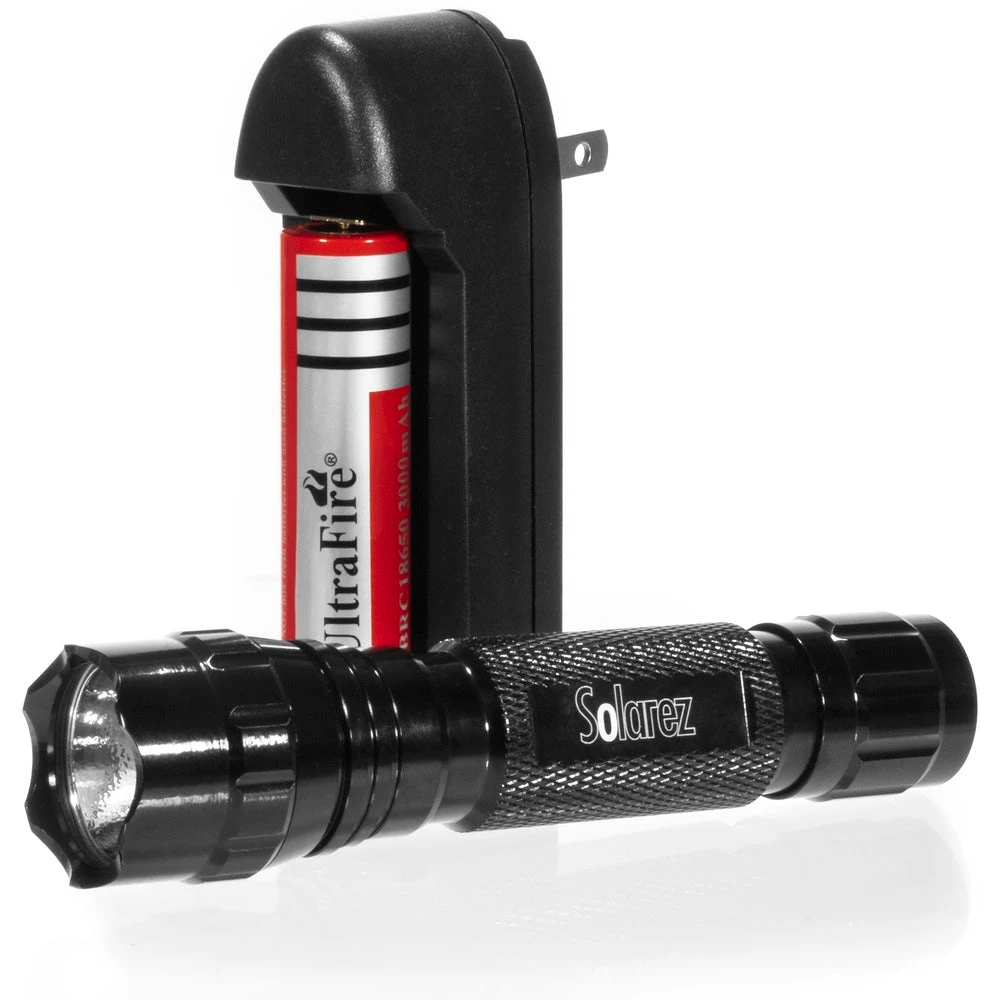 Newest technology SMD ultra high output flashlight. Cures Solarez resin with the correct wavelength. Typically cures Solarez resin in 30 seconds or less. Also has heat-abating “Pulse Power” function. This reduces resin shrinkage and yellowing and increases bond. Comes complete with one rechargeable 18650 Lithium Ion battery and digital battery charger, good for hours of high-intensity light and hundreds of re-charges. Charger has polarity indicator warning and READY signal.